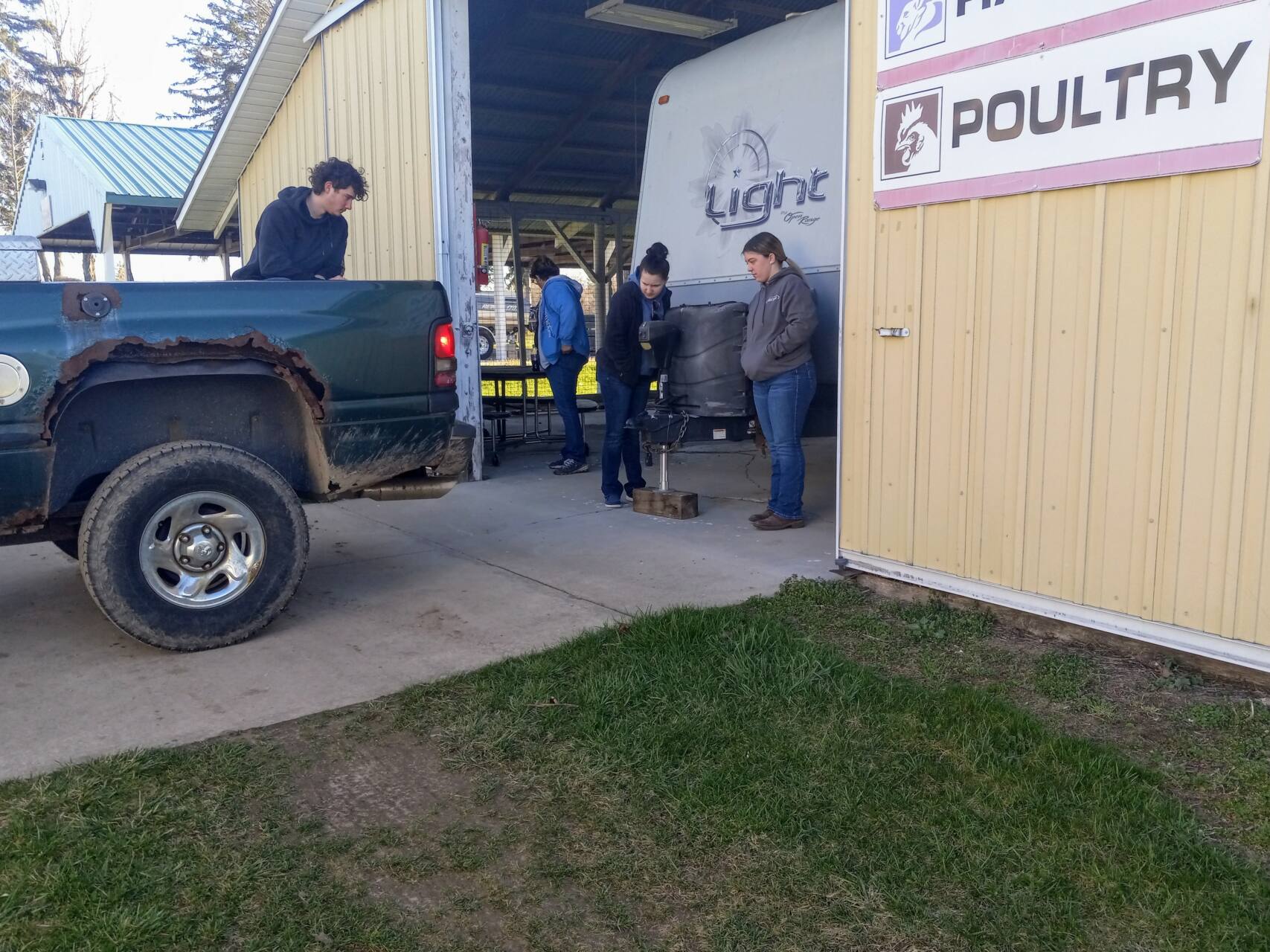 We have ample semi secure storage available this year. We’ve rebuilt the Livestock Pavilion and it is much taller and can accommodate many more units. Semi Secure is a hard roof supported by posts. There are either no walls or short walls that do not keep people or animals outside. The benefit is that the roof protects your unit from the elements. We do park these units close enough that no one can get between them or into them.